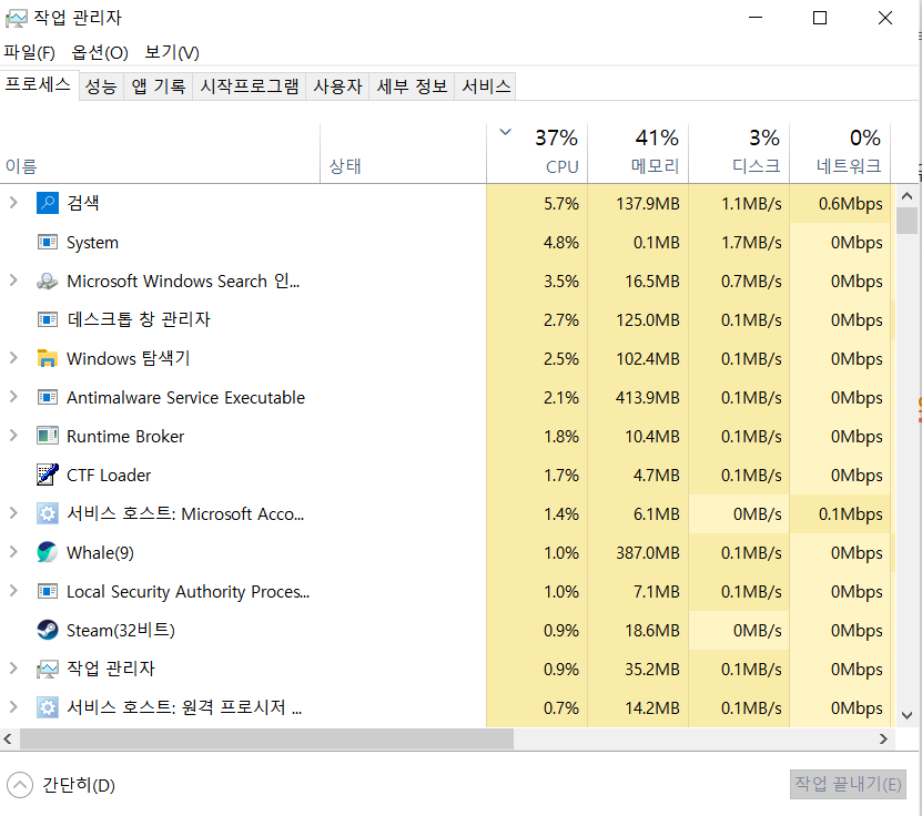 윈도우 유저라면 ctrl+Alt+Del에서 볼 수 있는 작업관리자를 띄워보면 이 곳에 프로세스가 있다.
