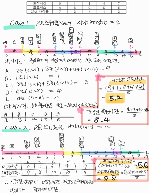 2. (3) 프로세스별 도착시간과 필요한 CPU 사이클이 표와 같고 RR 스케쥴링 알고리즘을 이용할 때, 시간할당량이 2인 경우와 10인 경우 각각에 대해 프로세스가 실행되는 순서를 시간과 함께 표시하고, 평균 대기시간과 평균 반환시간도 각각 구하시오.